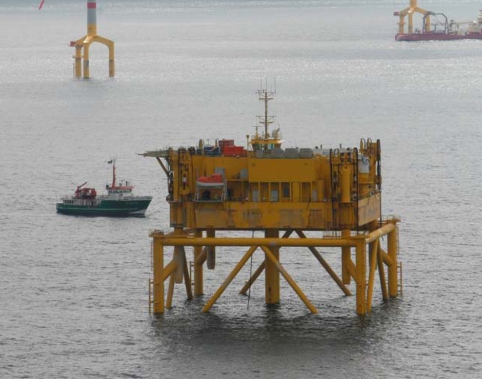 The BARD 1 wind farm is located in the North Sea and has a total of 80 wind turbines producing up to 400 MW which is connected into the german extra-high-voltage grid via a 125km long submarine cable. DLT supplied and operated a 16 x DL-S588 computer controlled strand jack system for the self-installation of the central transformer and accomodation platform. The strand jack system was used to suspend the 3,500 tonne jacket from the floating platform during sea transport, then to lower the jacket down onto the sea bed, and finaly to lift the 3,320 tonne platform up out of the sea into final operating position where it was then structurally connected to the jacket.