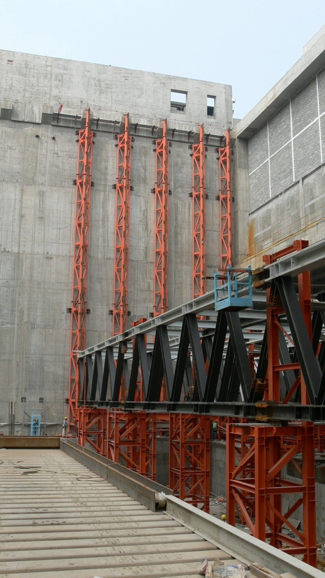 The climbing jacksl lifted against a temporary extension beam which cantileved from the end of each truss. Afrter each section of the roof structure was lifted into its final position, infill members were connected between the end of the truss and the permanent bearing plates previously cast in to the concrete walls. The load was then released from the climbing jacks.